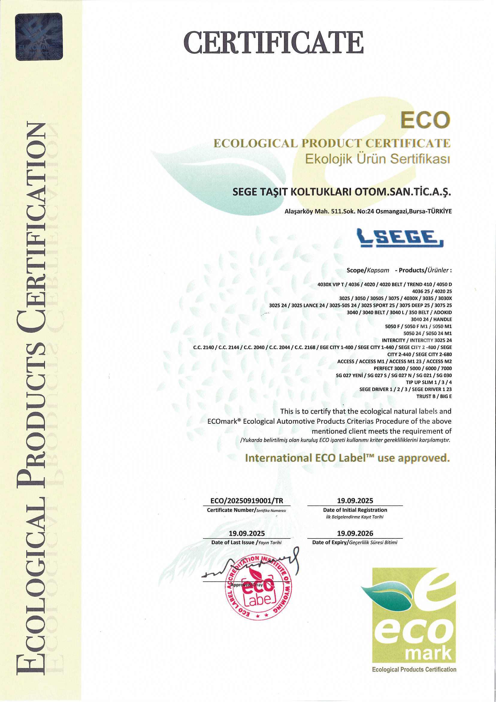 | Sertifika No | ECO/20250919001/TR | |